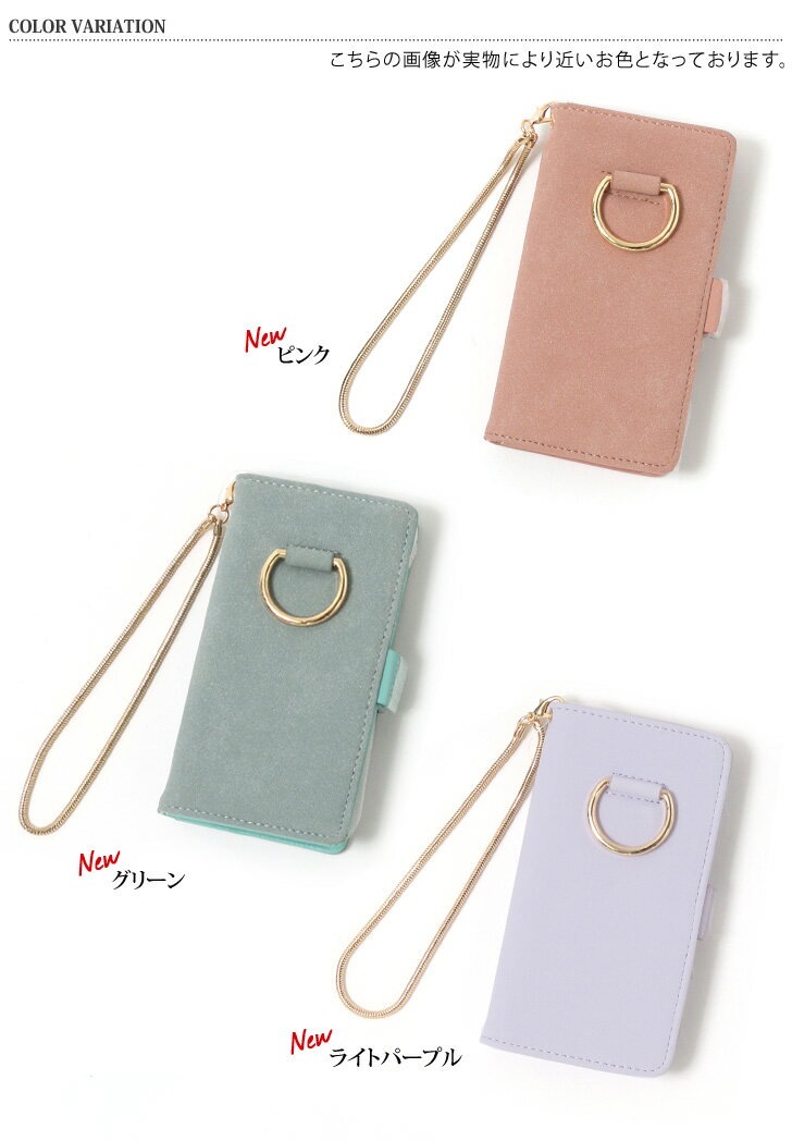 ■対応機種:iPhone6、iPhone6s、iPhone7、iPhone8■サイズ:タテ約14.5cm×ヨコ約7.5cm×厚さ約2cm■仕様:カードポケット×4、オープンポケット×1、ミラー×1■重さ:90g■付属品:ハンドチェーンストラップ■生産:中国製■素材感:【外側】スウェード調 【内側】光沢のあるフェイクレザー ■注意事項:このリングはデザインです。